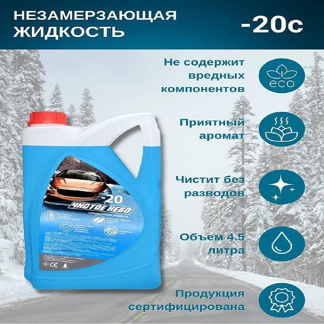 Стеклоомывающая жидкость ХимПродукт Чистое Небо - 20С, 4 л ПЭТ СОЖ-204 педназначена для использования в системе омывания стекол в зимний период. Защищает стекло и его контур от замерзания при температуре до -20 °С. Уникальная химическая формула позволяет эффективно удалять грязь, соль и нефтяную пленку, не оставляя разводов. Жидкость безвредна для лакокрасочных покрытий и резинок стекол. Не оставляет биологических загрязнений, бликов, масляных пятен и разводов на стекле, повышая уровень безопасности управления автомобилем.