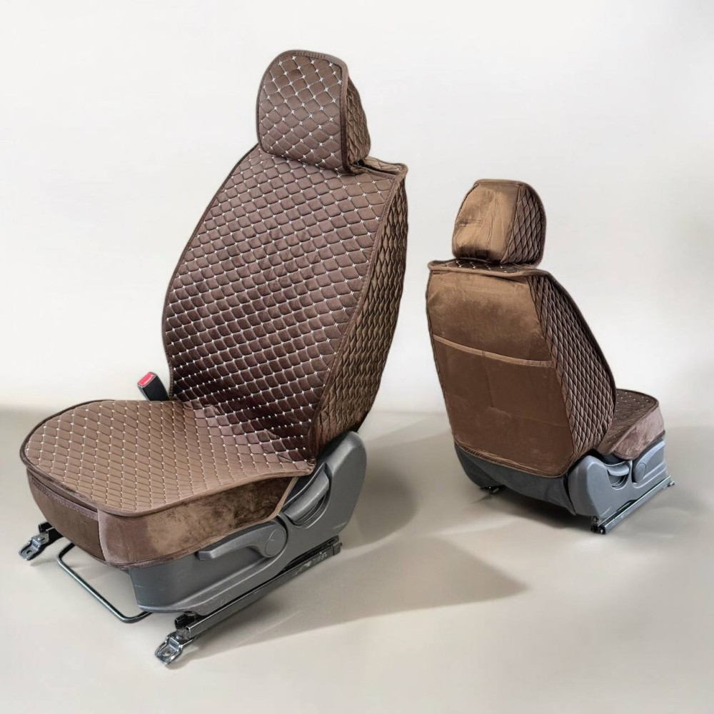 Комплект накидок из Велюра Ромб. Перед: цельная накидка с цельным подголовником, закрытые бока гармошка, на юбки имеется карман, спинка велюр, два кармана, противоскользящий материал подкладки. Задний цельный диван с юбкой из велюра, спинка раздельная из 3-х частей, 2 цельных подголовника + 1 деление спинки с 2-мя молниями заднего сидения, надежное крепление к сидению, легкая самостоятельная установка.