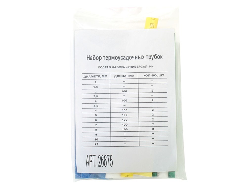 Набор термоусадочных трубок изготовлены из полиэтилена - материала, который подавляет горение. Трубки обладают высокими электрическими и механическими параметрами. Служат для использования в качестве изолирующих и уплотняющих материалов. Изделия усаживаются в 2 раза, принимая форму предметов. В комплекте представлены трубки следующих цветовых вариантов: белые, желтые, желто-зеленые, зеленые, красные, синие и черные. Диаметр 2 мм, 3 мм, 4 мм, 5 мм, 6 мм, 7 мм, 8 мм- длина 100мм, количество по 2шт.