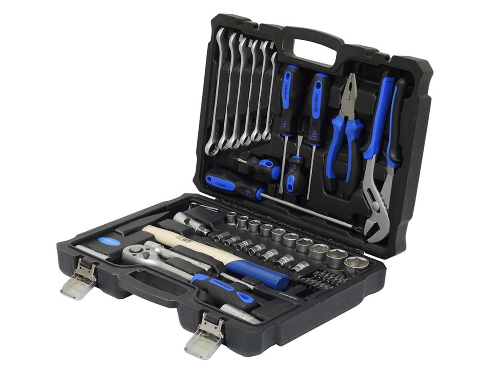 Состав набора: 1 Клещи переставные 250мм, 1 Пассатижи 180мм, 2 Отвертки SL6 40- 100мм, 2 Отвертки PH2 40-100мм, 1 Отвертка PZ2 200мм, 6 Ключей комбинированных 11-12-13-14-15-17мм, 4 Ключа 6гр. г-образный 1.5-2-3-4мм, 10 Головок 6гр. ? 10-12-13-14-15-17-19-22-24-27мм, 1 Кардан шарнирный ?, 1 Адаптер-переходник ?, 6 Головок 6гр. ? 8-9-10-11-12-13мм, 3 Биты TORX T10-T15-T20-T25-T27-T30-T40, 1 Молоток 300гр, 1 Удлинитель ? 125мм, 1 Рукоятка ?, 1 Трещотка ?, 2 Свечные головки ? 16-21мм.
