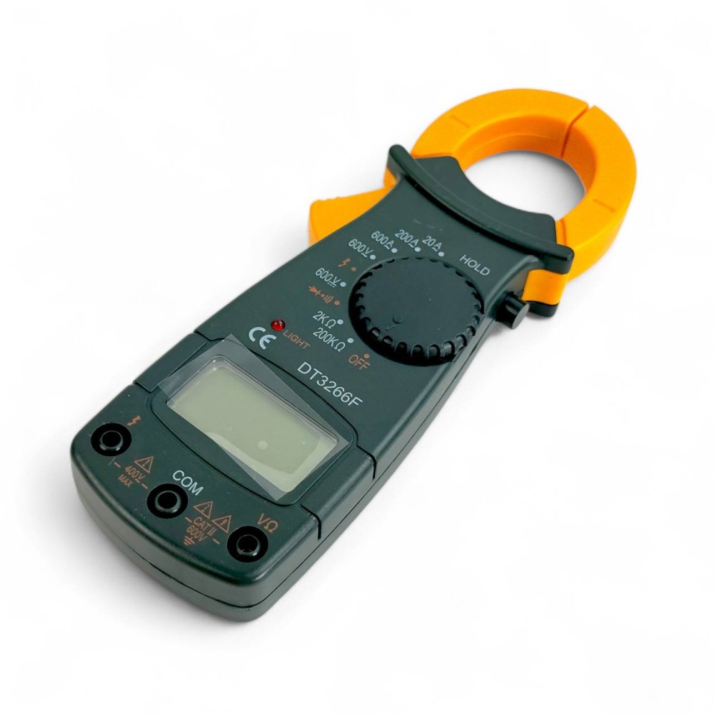 Мультиметр цифровой - клещи предназначен для измерения постоянного и переменного напряжения, переменного тока, сопротивления, а также для тестирования диодов. Оснащен функцией удержания данных HOLD. Большой 3,5-разрядный жидкокристаллический экран. Автоопределение полярности.Разрядность дисплея — 1999 отсчетов. Размер открытия клещей — 25 мм. Максимальный диаметр отверстия клещей — 30 мм. Метод измерений — двойное аналогово-цифровое интегрирование. Детектирование высокого напряжения.Тестирование на проводимость. Тестирование p-n-переходов.Функция определения фазного провода. Измерение постоянного и переменного напряжения — 600 В.Диапазон переменного тока — 20/200/600 А. Сопротивление резисторов — 2КОм/200КОм/2 Мом. Входное сопротивление — 10 Мом. Защита от перегрузки — 250 В.