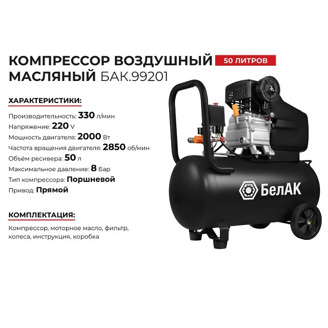 Компрессор 330 л/мин однопоршневой воздушный масляный для гаража 50л, 2000Вт, 8 бар 220В