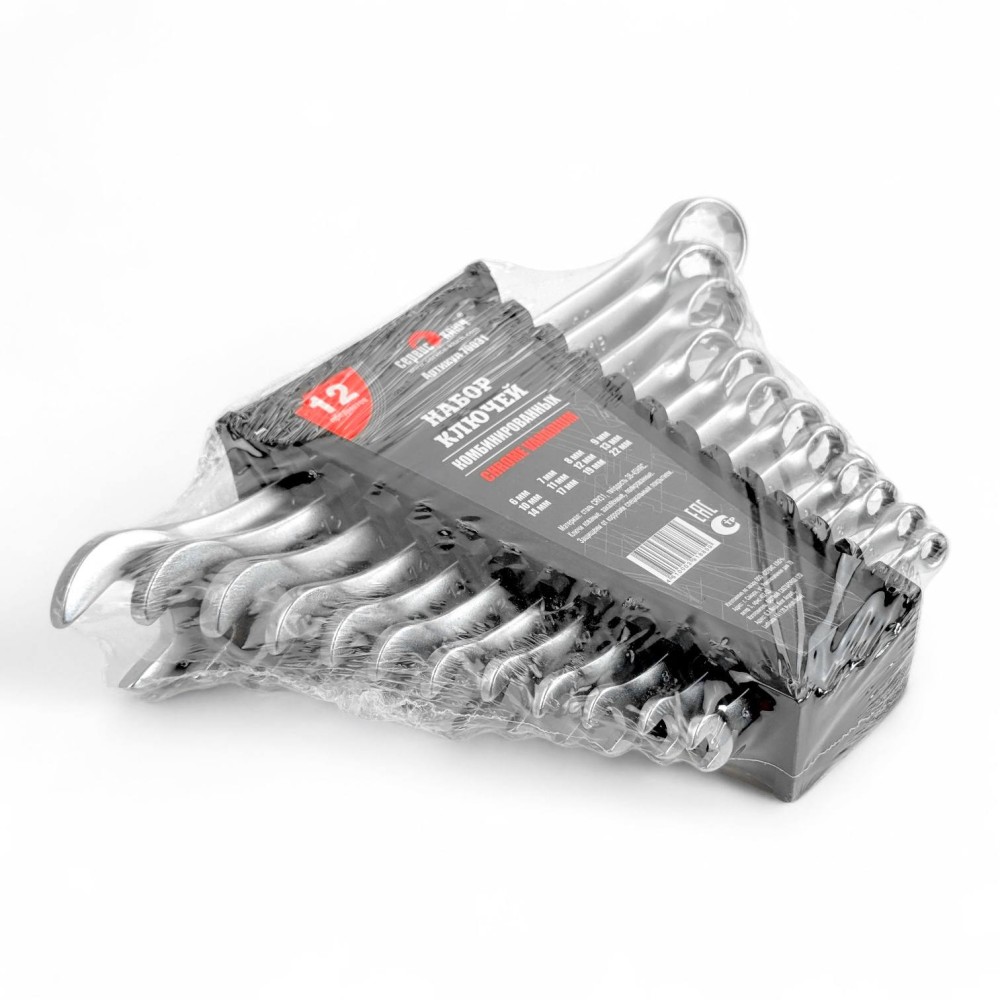 Набор комбинированных ключей СЕРВИС КЛЮЧ (12 предметов) – это универсальный комплект ключей, которые подходят для работы с шестигранным крепежом разных размеров. Удобство этого ключа в том, что с одной стороны ключа – стандартный открытый захват (рожковый), с другой – кольцевой (накидной), который имеет 12 граней для улучшения захвата при работе с «трудным» крепежом. Инструмент широко используется в быту, в промышленной и автомобильной сфере.Набор ключей состоит из двенадцати ключей разных размеров: 6, 7, 8, 9, 10, 11, 12, 13, 14, 17, 19 и 22 мм. Они изготовлены из прочной хром-ванадиевой стали 31, а также имеют хромированное покрытие, которое защищает их от коррозии.