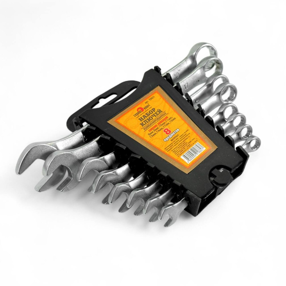 Набор комбинированных ключей СЕРВИС КЛЮЧ (8 предметов) — это универсальный комплект ключей, которые подходят для работы с шестигранным крепежом разных размеров. Удобство этого ключа в том, что с одной стороны ключа – стандартный открытый захват (рожковый), с другой – кольцевой (накидной), который имеет 12 граней для улучшения захвата при работе с «трудным» крепежом. Инструмент широко используется в быту, в промышленной и автомобильной сфере. Набор ключей состоит из восьми ключей разных размеров: 8, 9, 10, 11, 13, 14, 17 и 19 мм. Они изготовлены из прочной хром-ванадиевой стали 31, а также имеют хромированное покрытие, которое защищает их от коррозии.