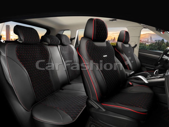 Материал - велюр/экокожа. Центр - велюр. Задняя спинка передних сидений - экокожа. Противоскользящая подкладка. Раздельный крой передних сидений. 5 раздельных подголовников. 2 молнии для деления спинки заднего сиденья. Карманы на спинках передних сидений. Фиксаторы спинки заднего сиденья.