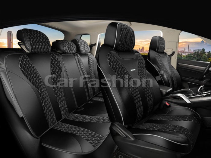 Материал - ICE SILK (Ледяной шелк). Центр - ICE SILK (Ледяной шелк). Задняя спинка передних сидений - ICE SILK. Противоскользящая подкладка. Раздельный крой передних сидений. 5 раздельных подголовников. 2 молнии для деления спинки заднего сиденья. Карманы на спинках передних сидений. Фиксаторы спинки заднего сиденья.
