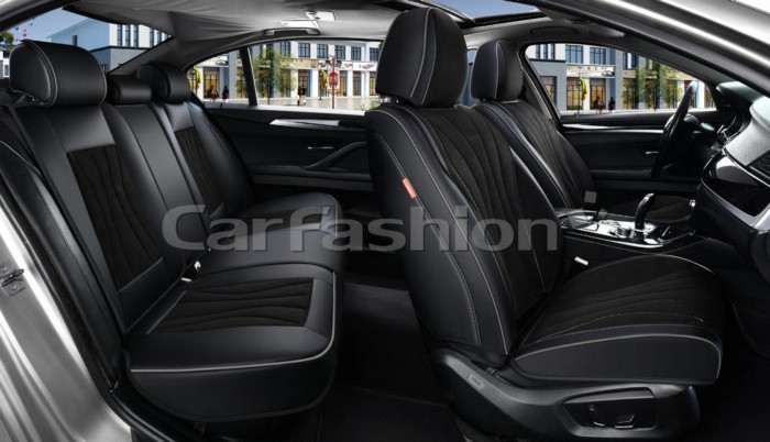 Описание: комплект каркасных чехлов. Материал - экокожа/искусственная замша. Центр - искусственная замша. Задняя спинка передних сидений - экокожа. Противоскользящая силиконовая подкладка. Закрывают боковины и спинку передних сидений. Карманы на спинках передних сидений. Липучки для деления задних сидений 5 раздельных подголовников. Надежное крепление к сиденью, легкая самостоятельная установка.