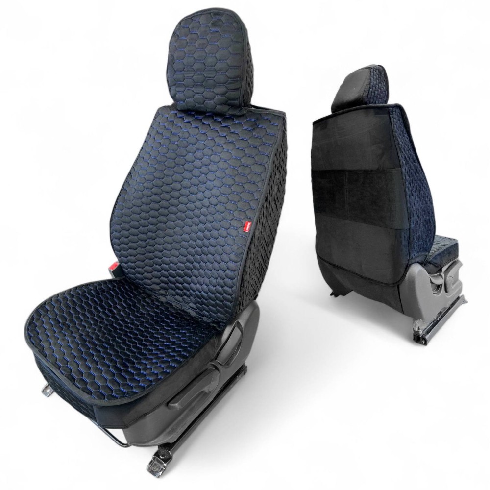 Комплект накидок на весь салон, ткань Велюр, рисунок сота, спинка из велюра, закрытые бока-гармошка велюр, цвет черный, строчка синяя, кант черный