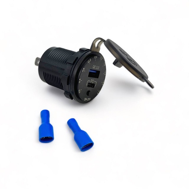 Разъем врезной, круглый в авто 12 В-24 В с быстрой зарядкой. Обеспечивает быструю зарядку совместимых устройств. Полная обратная совместимость со всеми версиями быстрой зарядки. На корпусе USB-розетки 12 В-24 В расположена кнопка вкл/выкл и вольтметр. Разъем оснащен светодиодным вольтметром для контроля за автомобильным аккумулятором во времени.