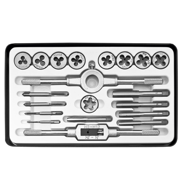 9 - метчик M3x0.5, M4x0.7, M5x0.8, M6x1, M7x1, M8x1.25, M9x1.25, M10x1.5, M12x1.75 9 - плашка M3x0.5, M4x0.7, M5x0.8, M6x1, M7x1, M8x1.25, M9x1.25, M10x1.5, M12x1.75 1 - метчикодержатель M3 - M12 1 - плашкодержатель 25 мм o/D Упаковка.