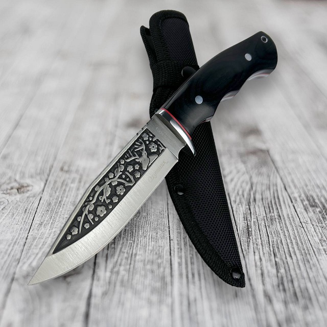 Нож выполнен из качественных материалов, рукоять из дерева надёжно проклёпана, оснащена двойным металлическим упором, которые украшенными резными гардами. Лезвие изготовлено из прочной ножевой стали 65х13 имеет длину 19 см, оно уже заточено и нож готов к работе.