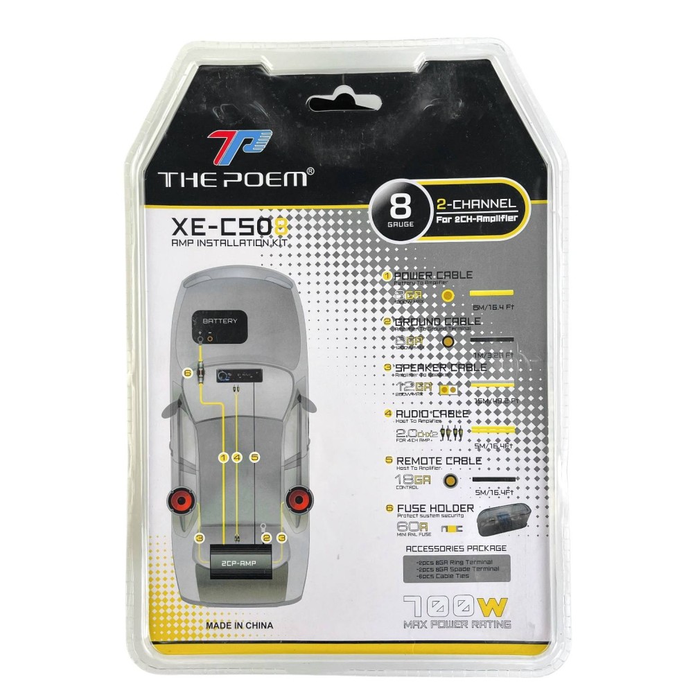 Комплектность: силовой кабель красный 5,3м 8GA с держателем предохранителя, заземляющий кабель черный 0,7 м 8GA, предохранитель 40А, кабель межблочный RCA - RCA 5 м, cиний акустический кабель 18GA - 5м, клеммы для силовых кабелей.