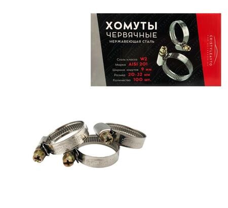 Хомут 20-32мм червячный W2, 9мм нержавейка (упаковка 100шт)