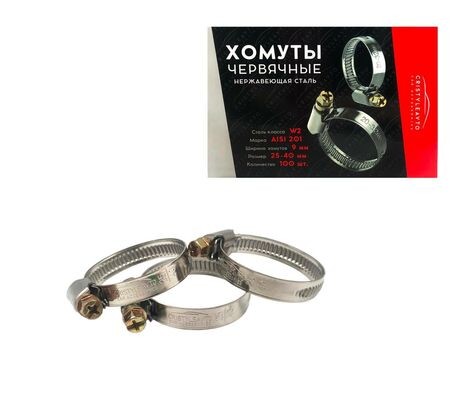 Хомут 25-40мм червячный W2, 9мм нержавейка (упаковка 100шт)