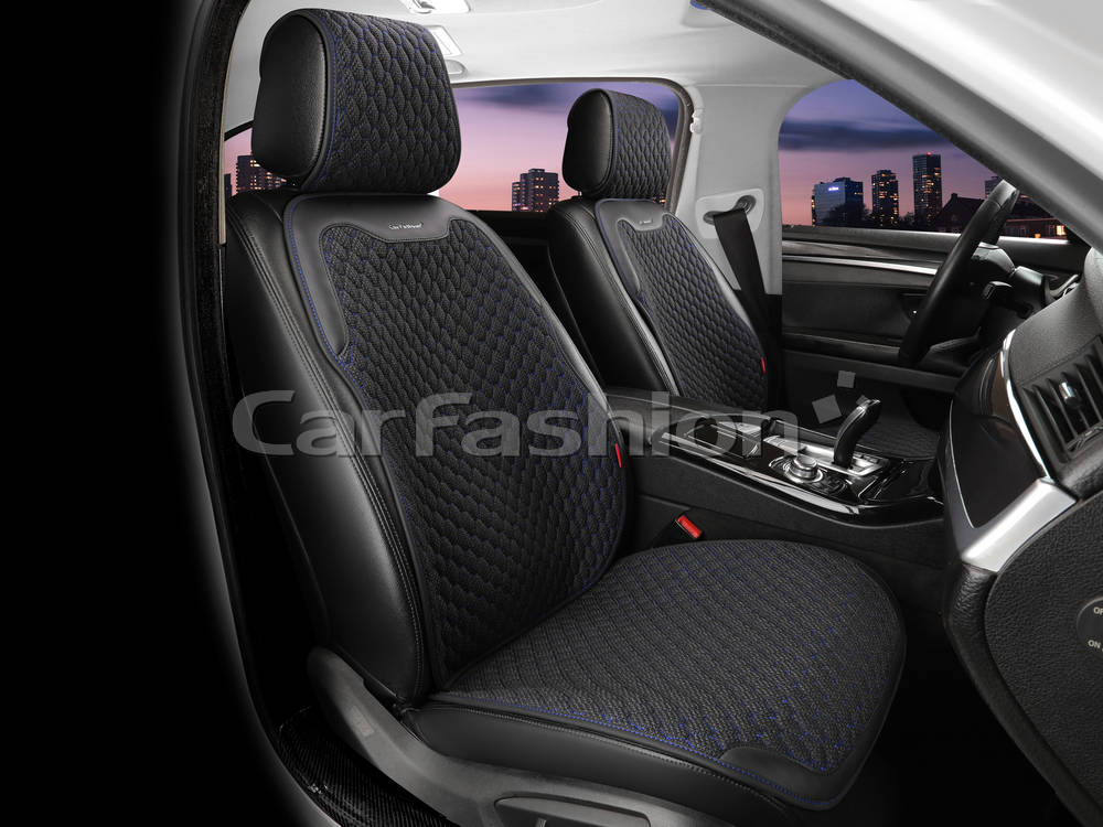 Накидки на передние сиденья 2D TERRA FRONT, материал твид + экоКожа, цвет черный, строчка синяя, кант черный