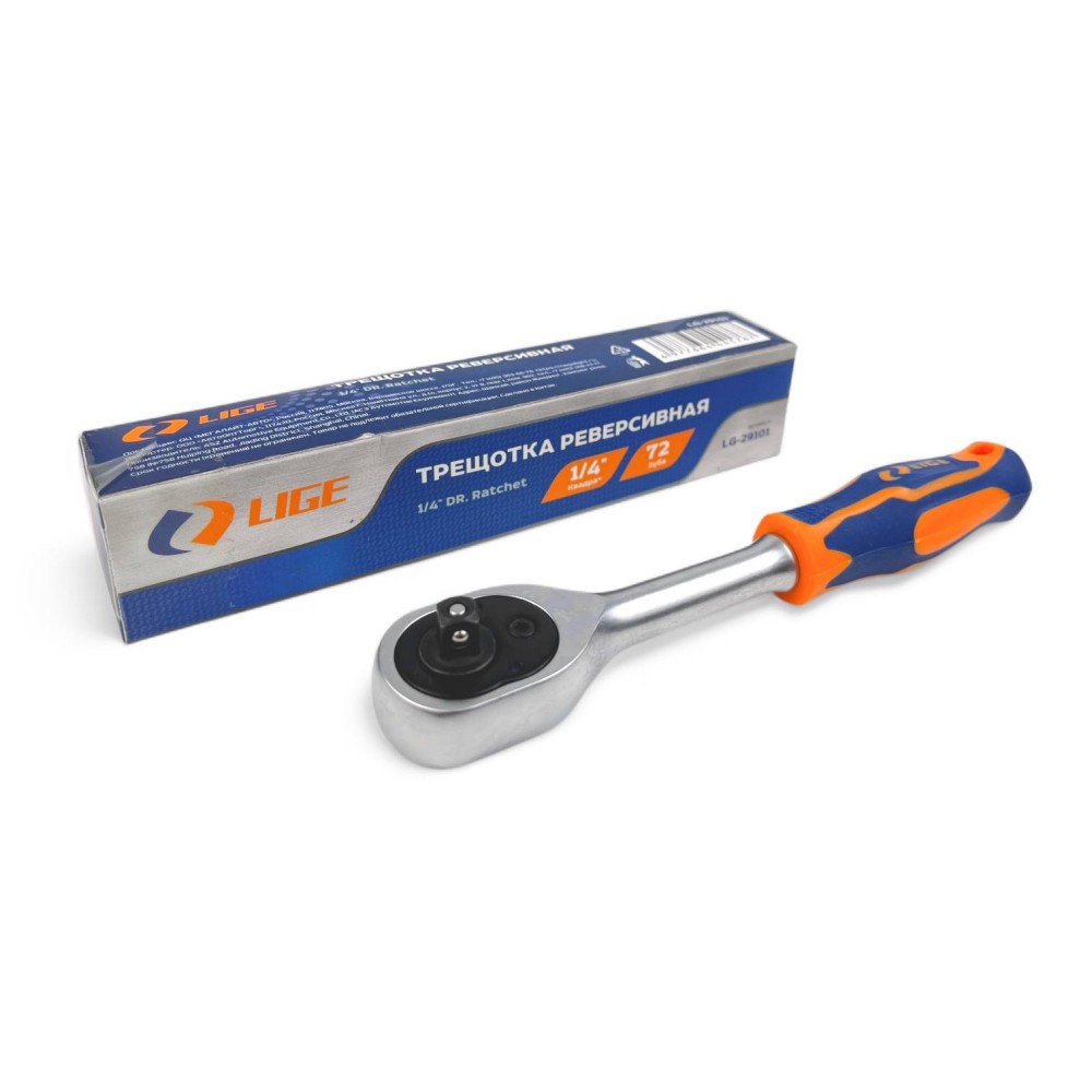 Трещотка реверсивная представляет собой ручной инструмент для слесарных работ. Трещотка с присоединительным квадратом 1/4 и 2-компонентной рукояткой предназначен для монтажных работ с резьбовыми соединениями. Храповый механизм с 72 зубцами обеспечивает высокую плавность работы. Ключи трещотки напоминают в работе накидные гаечные ключи, но при этом трещоточный ключ значительно экономит время и силы. Благодаря реверсивному механизму ключ-трещотку можно использовать, как для откручивания, так и для закручивания крепежей. Трещотка ключ обладает кнопкой быстрого сброса, что упрощает съем и установку насадок. Ключ с квадратом 1/4надежно фиксирует оснастку и не дает соскальзывать во время работы.
