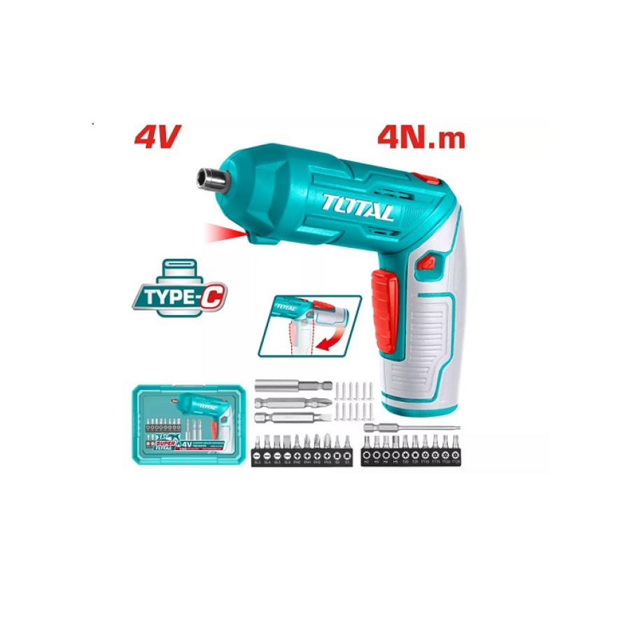 Комплектация: 20 шт 25 мм бит Cr-V + держатель, 2 шт 50 мм бит Cr-V + держатель, 1 шт 74 мм бит Cr-V, 1 шт соединитель. Отвертка аккумуляторная TOTAL TSDLI04425 - это практичный инструмент для бытового использования. Благодаря наличию подсветки, вы сможете работать с ней даже в условиях плохой освещенности. Отвертка имеет максимальный крутящий момент 4 Нм и работает на одной скорости, обеспечивая стабильную и надежную работу. Литий-ионный аккумулятор напряжением 4 В обеспечивает достаточную мощность для выполнения различных задач. С помощью этой отвертки вы сможете легко и быстро выполнить необходимые работы, а ее компактный чемодан/кейс позволяет удобно хранить и перевозить инструмент.